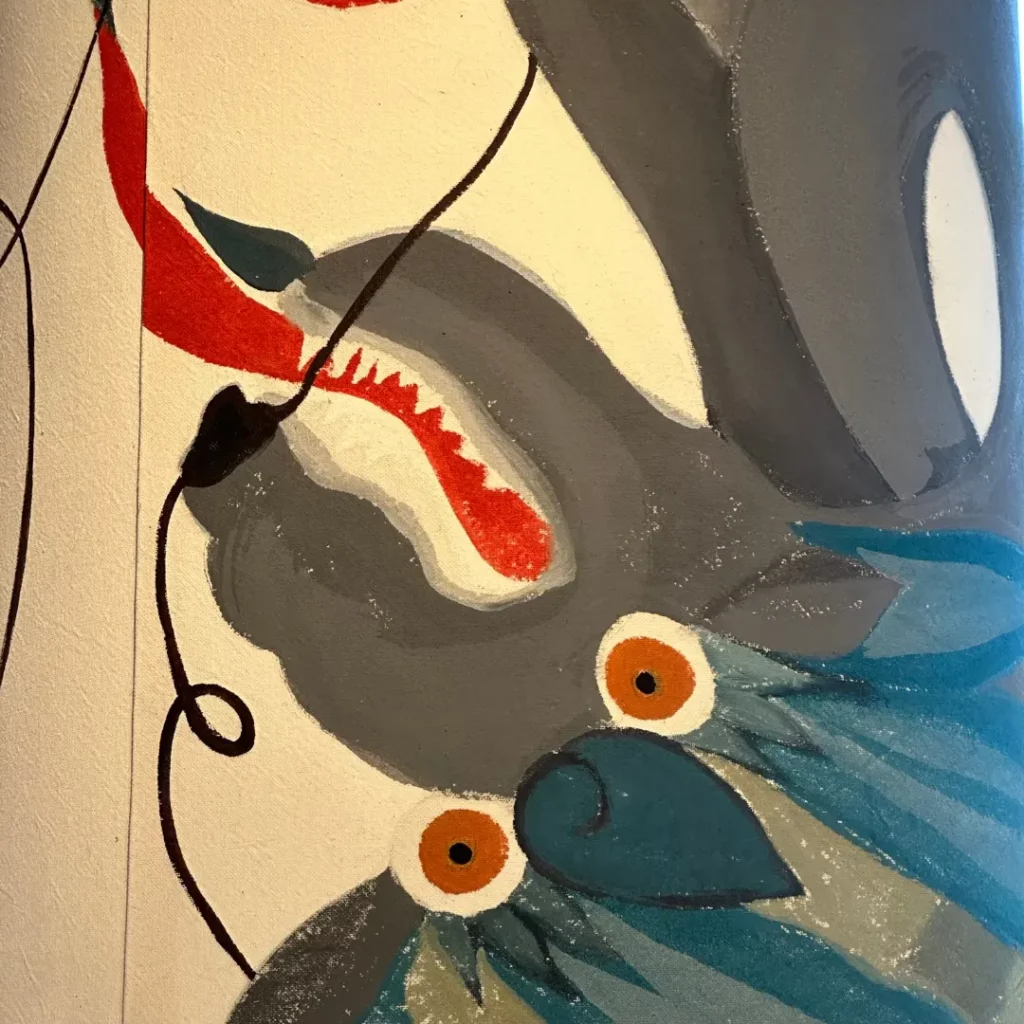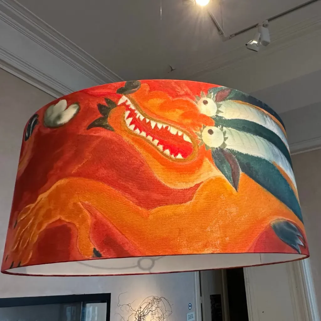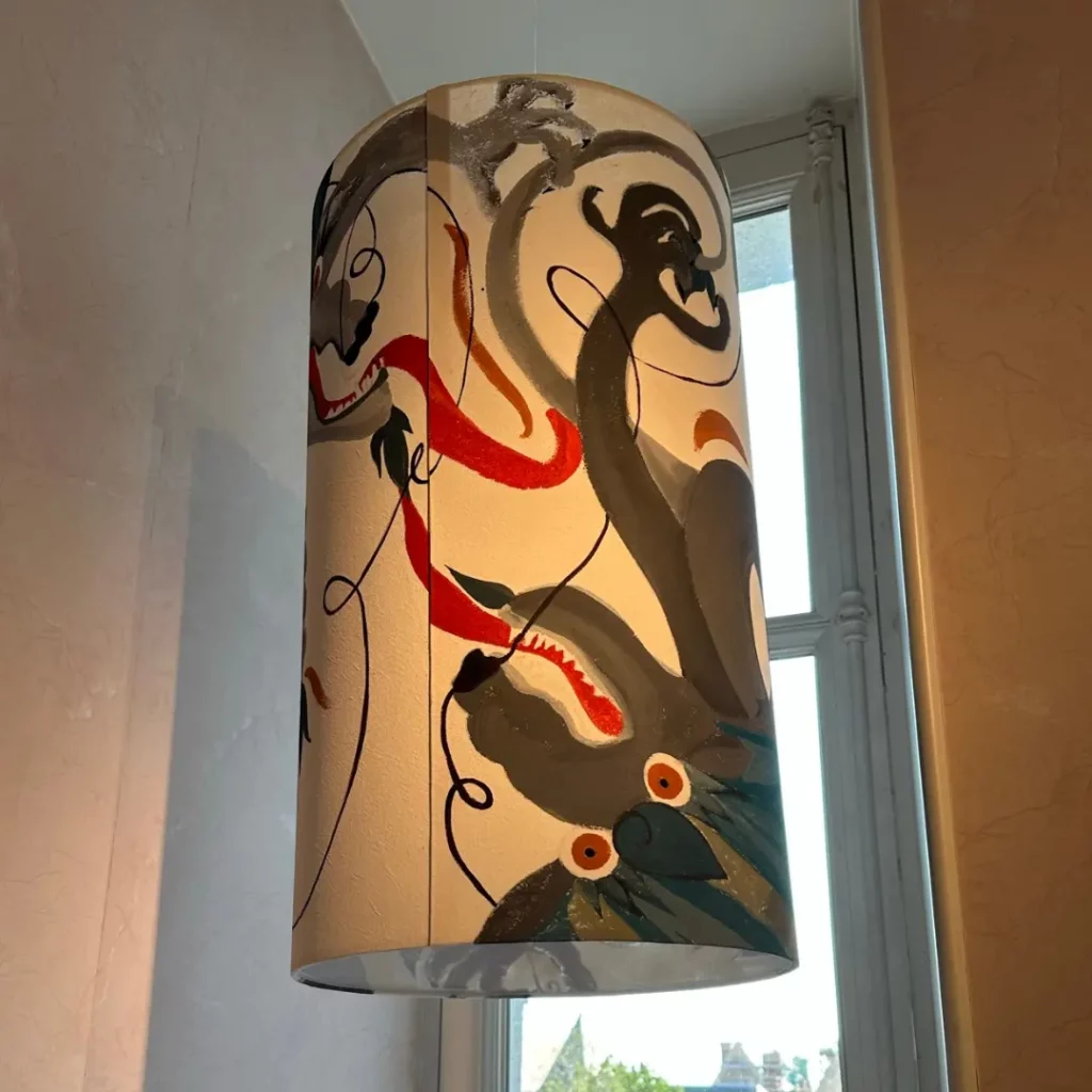 J’ai conçu et réalisé deux carcasses d’abat-jours XXL, façonnées avec exigence puis tendues de toile brute, supports choisis pour leur qualité et leur présence. Sur ces pièces, Fany a déployé son univers singulier en peignant des dragons fantasmagoriques issus de son imaginaire.