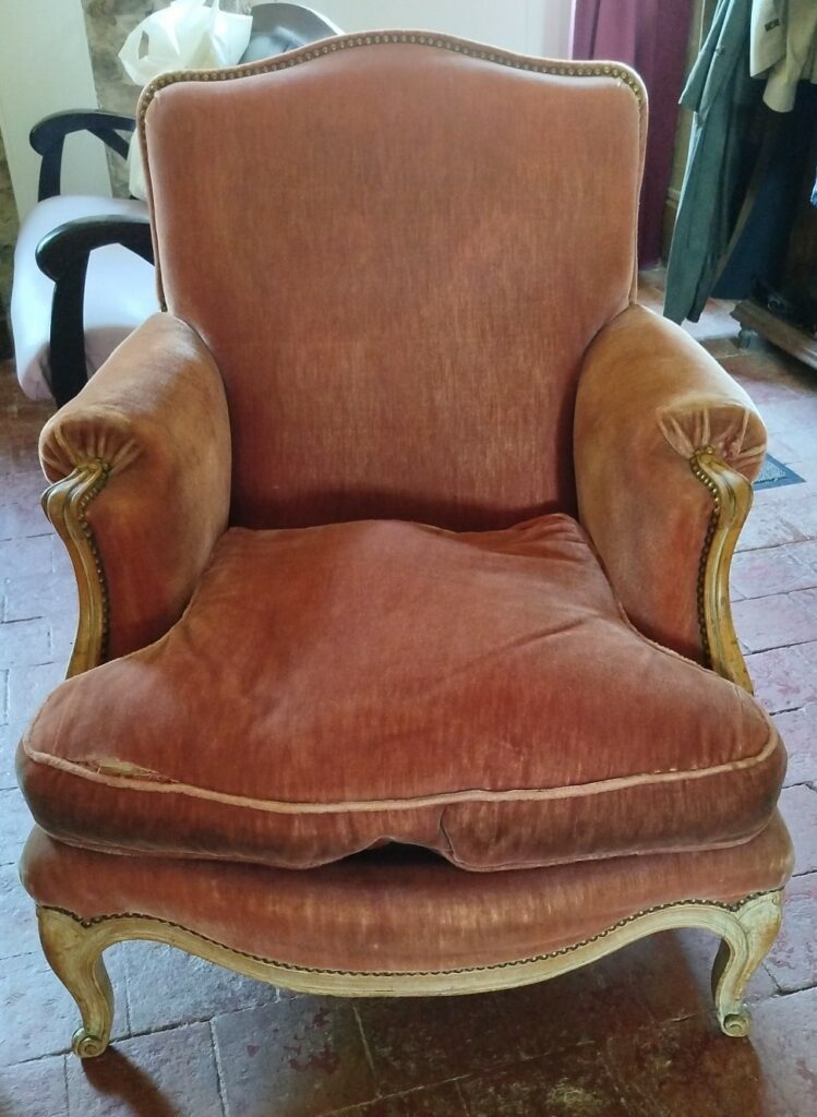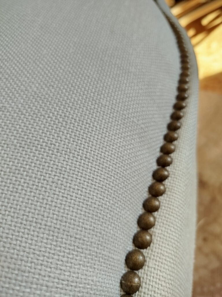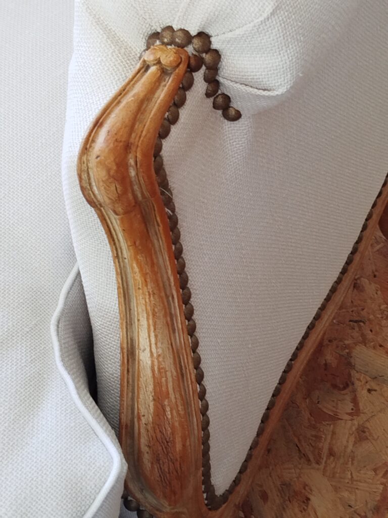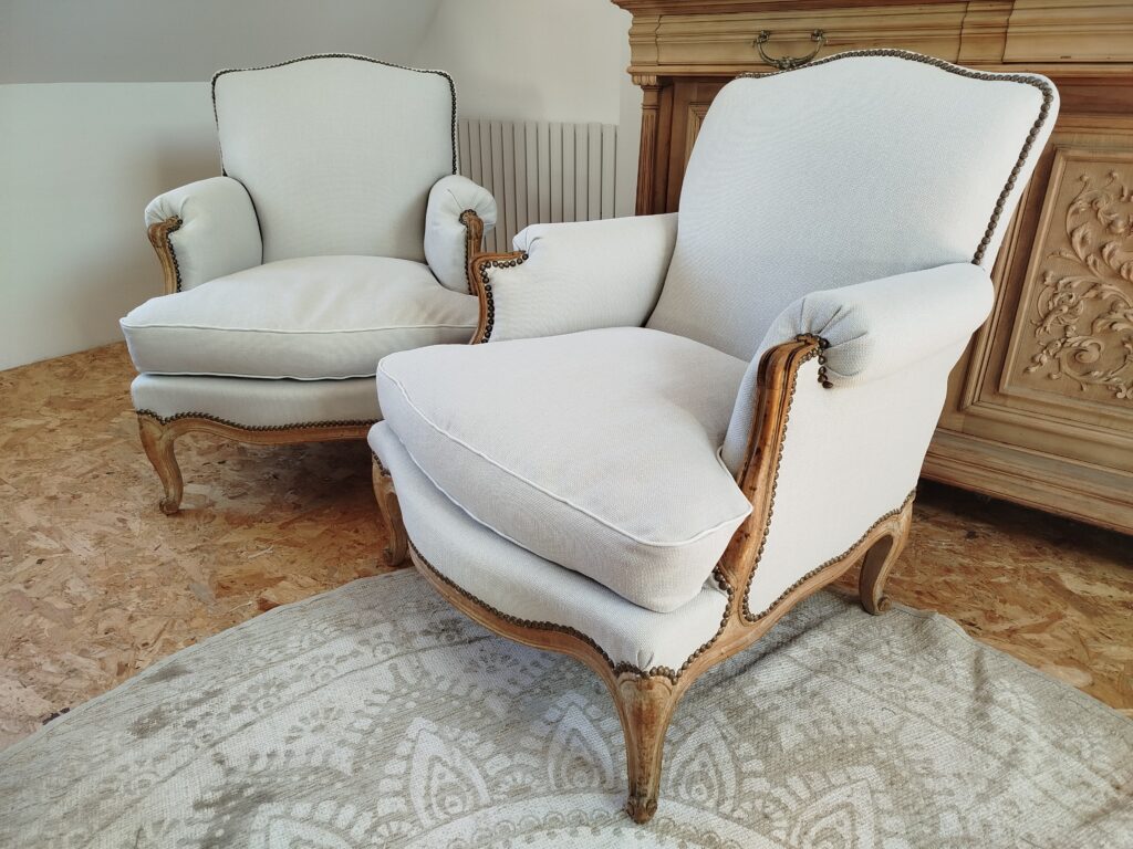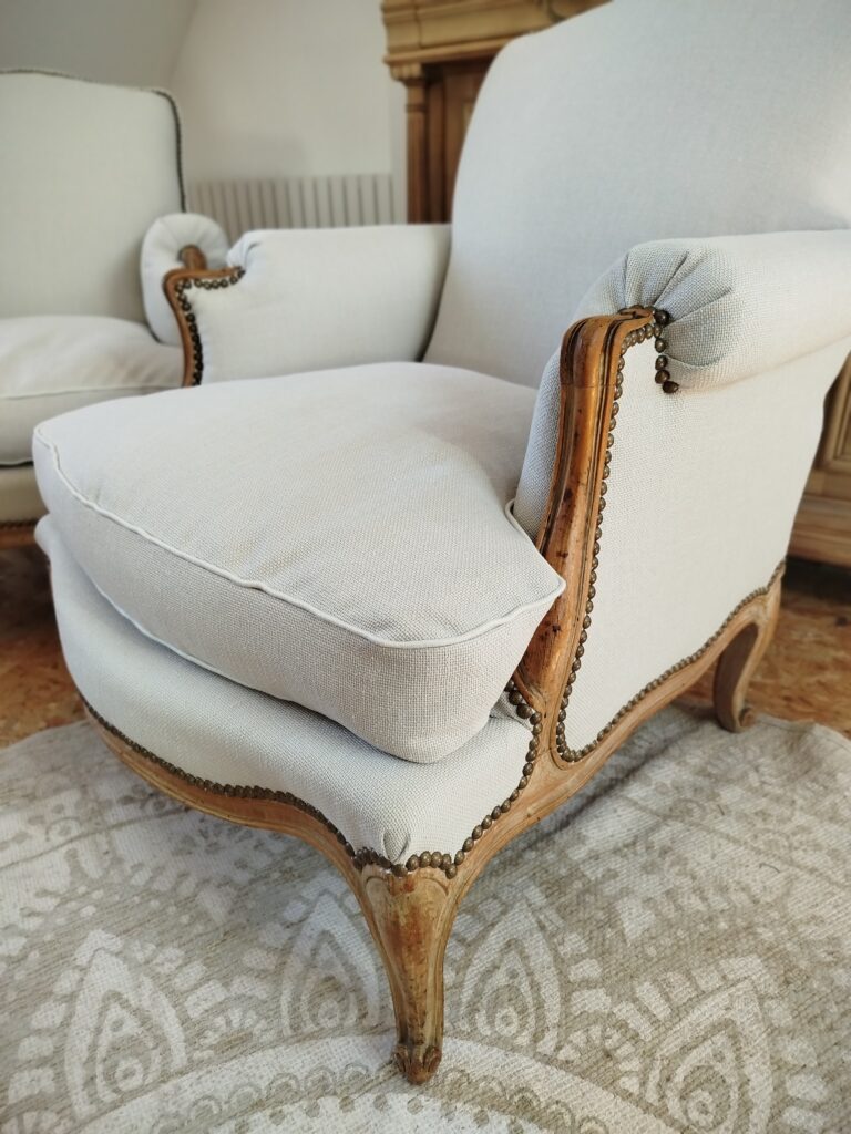 Restauration de deux bergères de style Louis XV : le tissu et les clous ont été changés, et les coussins refaits à l’identique (la garniture n’a pas été modifiée) – Tissu HAVANE, coloris Bouleau de chez CASAL Tissus & passepoil des Passementeries d’Ile de France, clous tapissier bronze vieilli