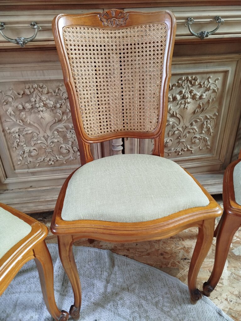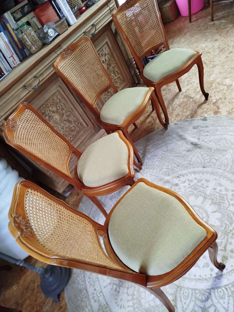 Chaises classiques de salle à manger : le cannage détérioré a été remplacé par des galettes – Tissu HAVANE, coloris Lichen de chez CASAL Tissus