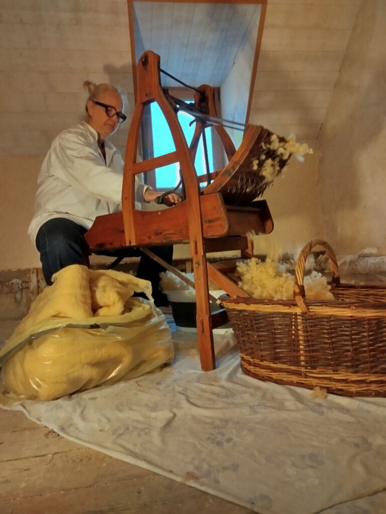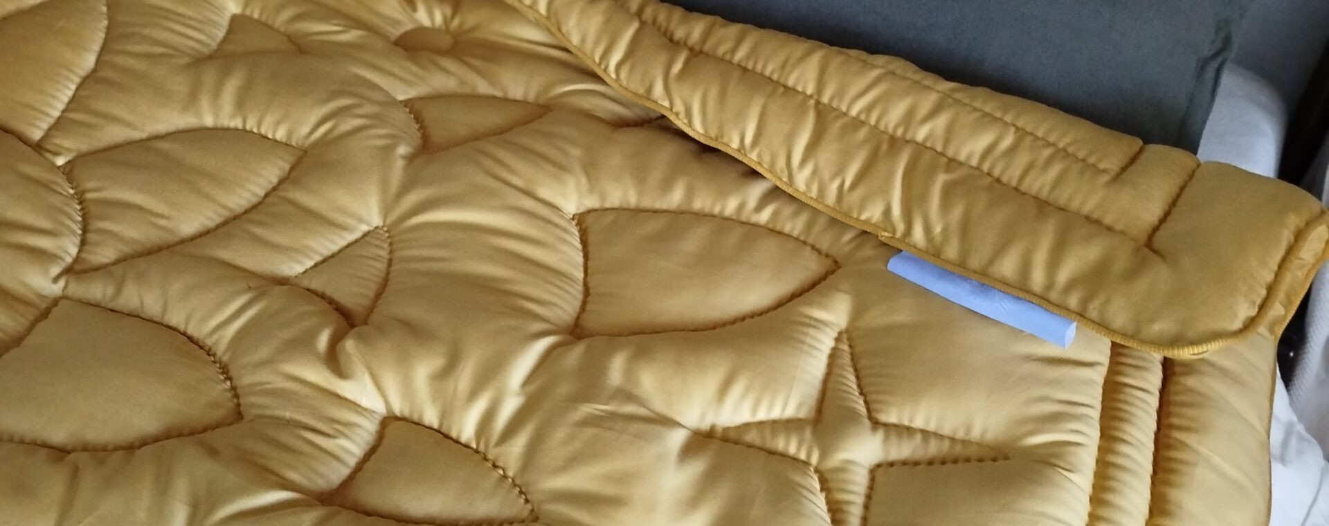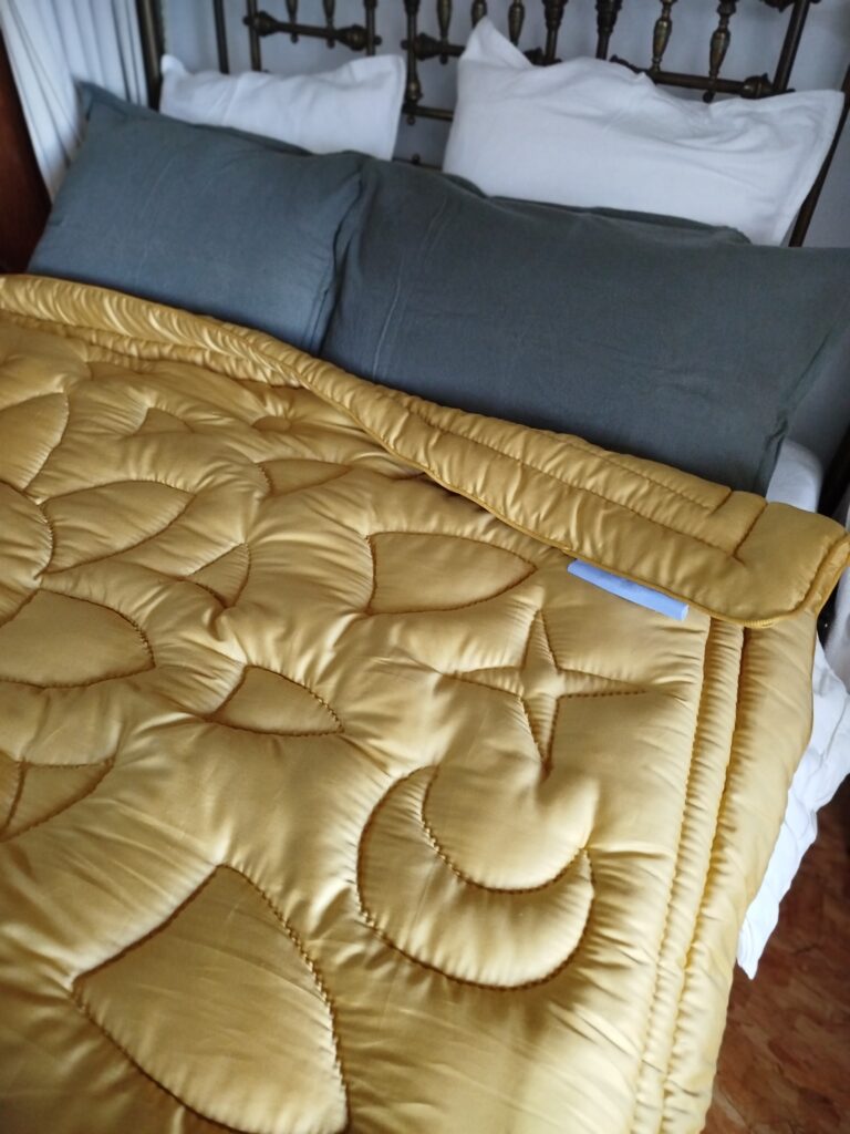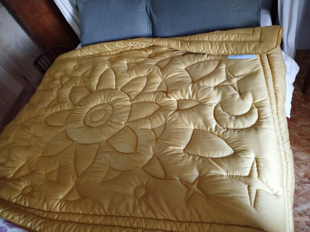 Autrefois façonnée à Vesdun il y a plusieurs dizaines d’années, cette courtepointe a traversé le temps pour renaître sous de nouvelles mains expertes. Sa laine, patiemment recardée, s’est glissée entre deux nappes neuves, et le tout s’est paré d’un satin jaune soleil, où l’astre, délicatement reproduit dans le piquage, semble veiller sur vos nuits.