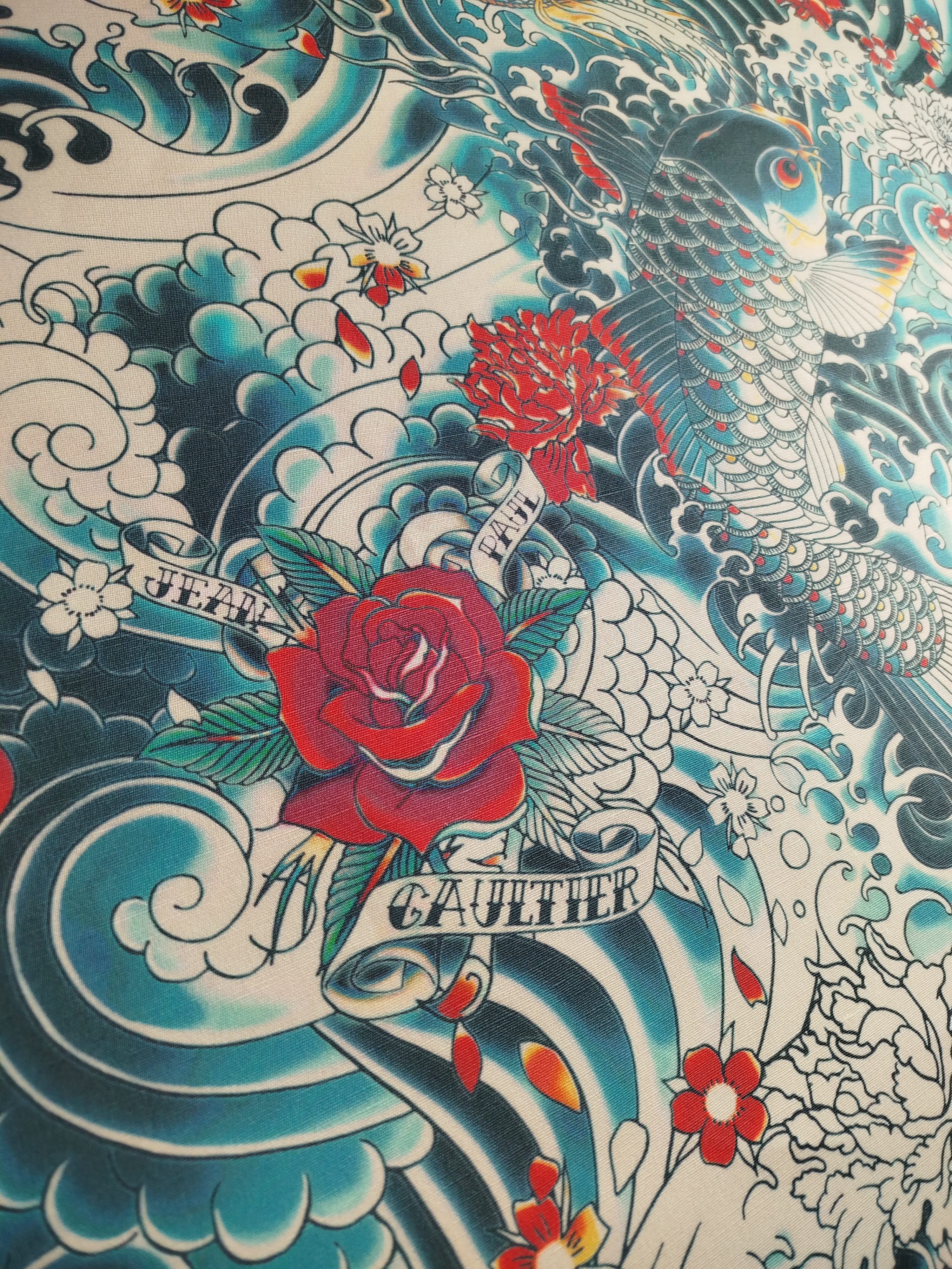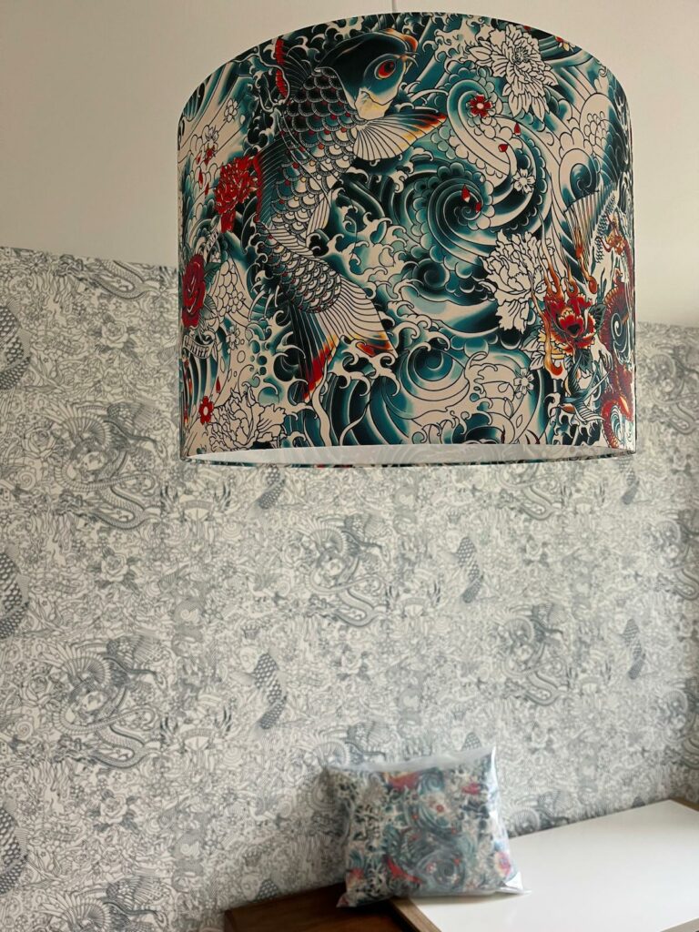For her renovated office, the client wanted something exceptional: the sumptuous ‘Rock’ fabric, designed by the extravagant Jean-Paul Gaultier for Maison Lelièvre, was transformed into a 50 cm diameter XL pendant light, entirely handmade. Every detail was carefully thought out: two separate pieces of fabric were assembled to enhance the richness of the patterns, with an invisible seam ensuring harmony and perfection throughout.