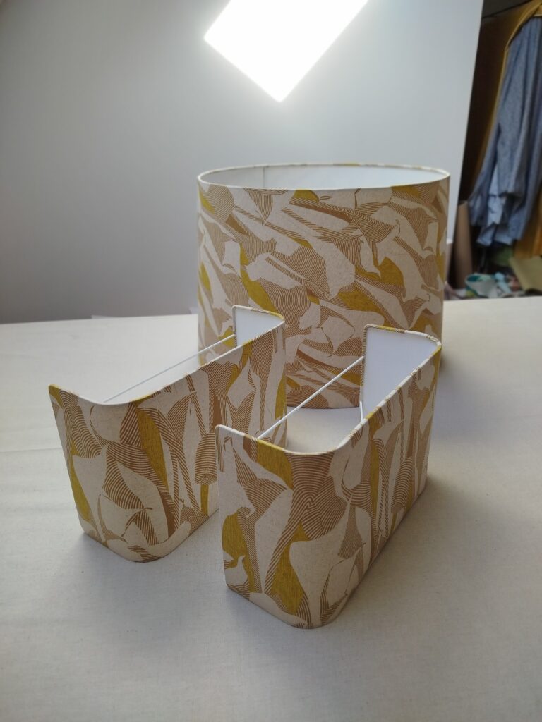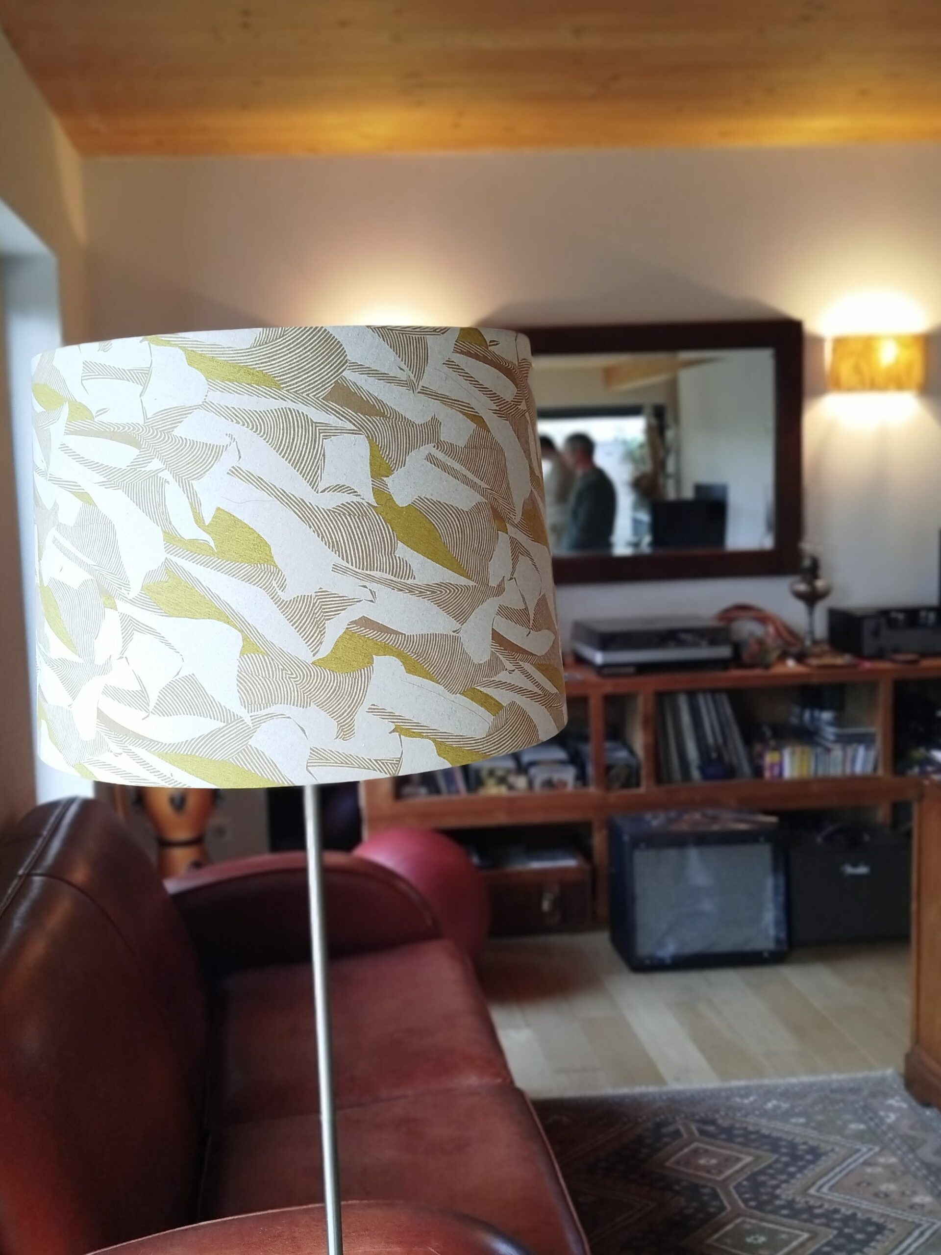 Set of lampshades to harmonise a living room: large conical lampshade for floor lamp & two matching wall light shades – Japanese imported fabric