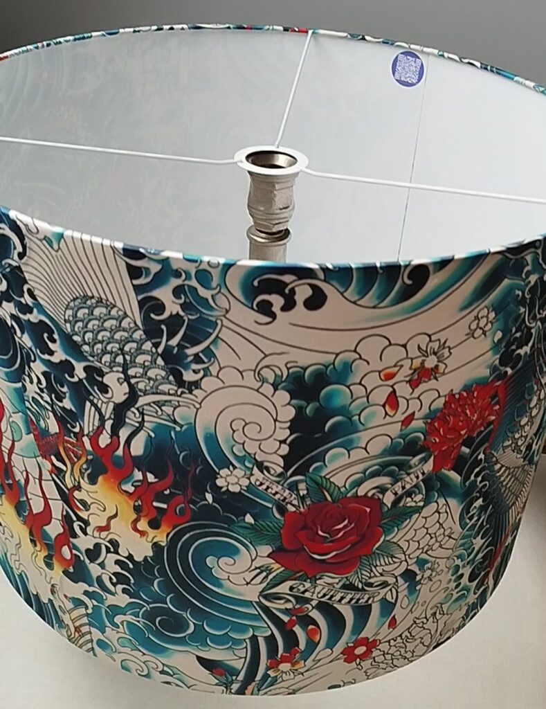 This XXL pagoda lightshade (54cm each side) was fully refreshed with a floral japanese fabric and constrasting ribbon