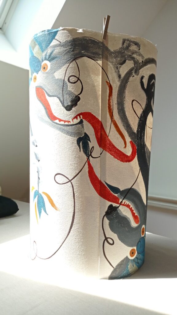 I designed and created two XXL lampshade frames, meticulously crafted and then covered with raw canvas, materials chosen for their quality and presence. Fany brought her unique world to life on these pieces by painting fantastical dragons from her imagination.